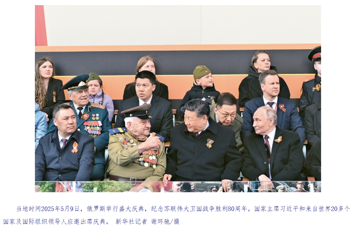 今年是中国人民抗日战争、苏联伟大卫国战争暨世界反法西斯战争胜利80周年。80年前,中俄两国人民付出巨大牺牲,赢得伟大胜利,为维护世界和平和人类进步事业作出彪炳史册的历史贡献。当前,面对国际上的单边主义逆流和强权霸凌行径,中方将同俄方一道,肩负起作为世界大国和联合国安理会常任理事国的特殊责任,挺膺担当,共同弘扬正确二战史观,维护联合国权威和地位,坚定捍卫二战胜利成果,坚决捍卫中俄两国及广大发展中国家权益,携手推动平等有序的世界多极化、普惠包容的经济全球化。