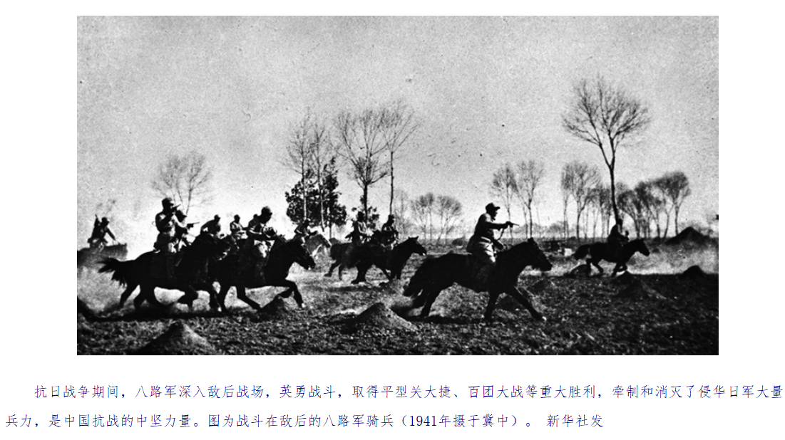 “遥望中原烽火急,狂流一柱在延安。”在抗日战争中,中国共产党领导的八路军、新四军和华南人民抗日游击队,累计歼灭日、伪军171.4万多人,抗击了60%的侵华日军和95%的伪军。到抗战结束时,中国共产党领导的抗日民主根据地即解放区已发展到19块,面积近100万平方公里,人口近1亿。在抗日战争血与火、生与死的严酷锻造中,中国共产党日益赢得中国人民的信任和拥护,自身也不断发展壮大、走向成熟,在思想上政治上组织上达到空前统一和团结,成为一个拥有120多万名党员、有着广泛群众基础、能够担负领导中国革命取得胜利重任的坚强有力的马克思主义政党。抗战胜利后,中国共产党团结带领中国人民很快就取得新民主主义革命的彻底胜利,领导我们这个曾经苦难深重的国家建立起人民当家作主的新中国,推进社会主义革命和建设,进行改革开放和社会主义现代化建设,开创中国特色社会主义新时代,取得举世瞩目的成就。历史深刻昭示,没有中国共产党就没有新中国,就没有中华民族伟大复兴。前进道路上,必须毫不动摇坚持和加强党的全面领导,坚决维护党中央权威和集中统一领导,使全党全国各族人民在党的旗帜下团结成“一块坚硬的钢铁”,推动复兴号巨轮不断破浪前行。