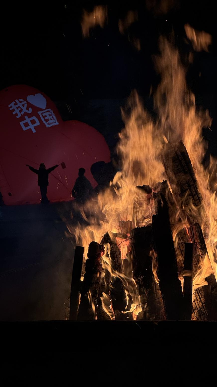 熊熊篝火燃烧,与“我爱中国” 的红心同框,似在中秋国庆双节之际,以热烈之姿,映照出家与国的深厚联结,满溢家国同庆的炽热情怀。